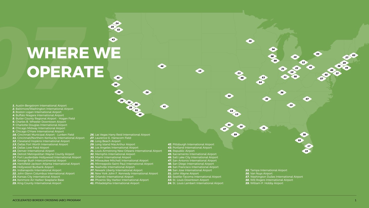 The ABC Program currently operates at more than 60 major U.S. airports, including key hubs in Los Angeles (LAX), New York (JFK and Newark), Miami, San Francisco, Washington (Dulles), Atlanta, Cleveland, among many others, enabling consistent execution regardless of entry point.